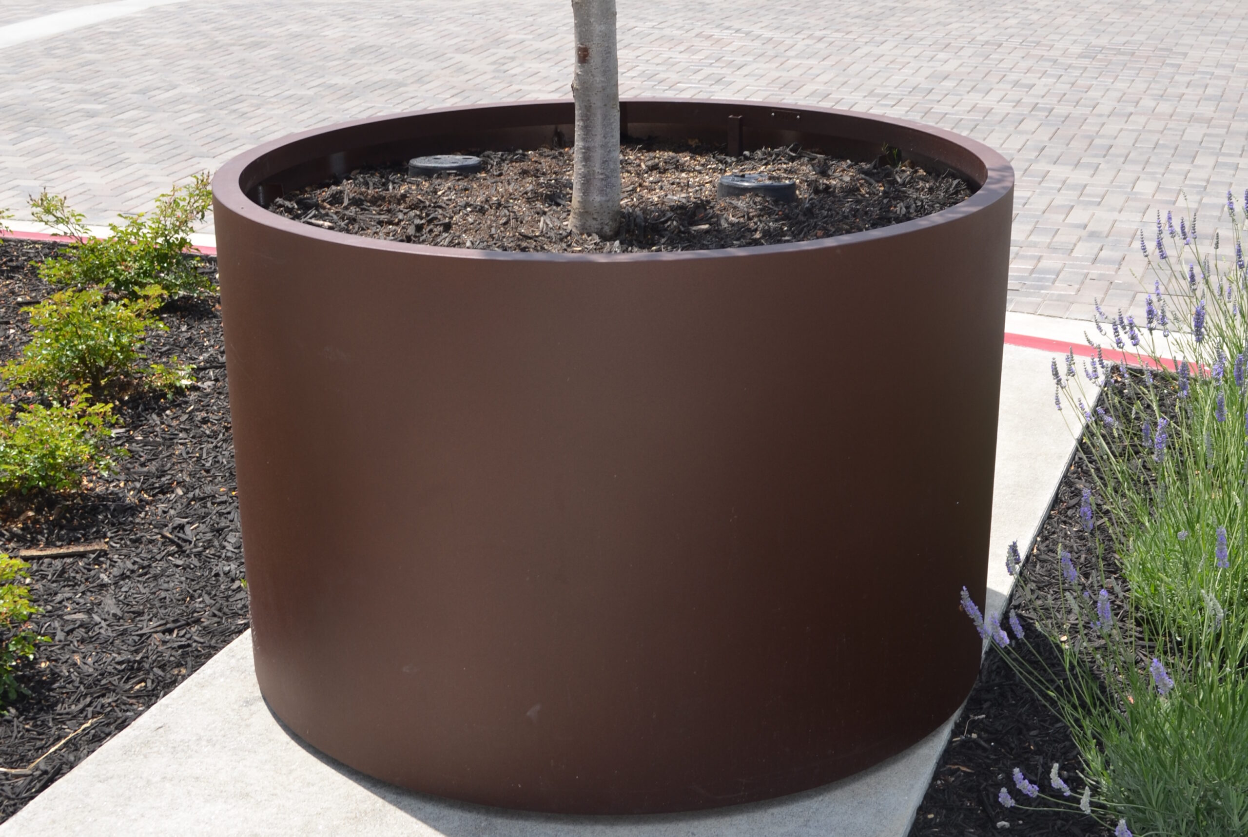 These custom 60″ Cylinder Planters are spread through the development with two pairs flanking the entrance