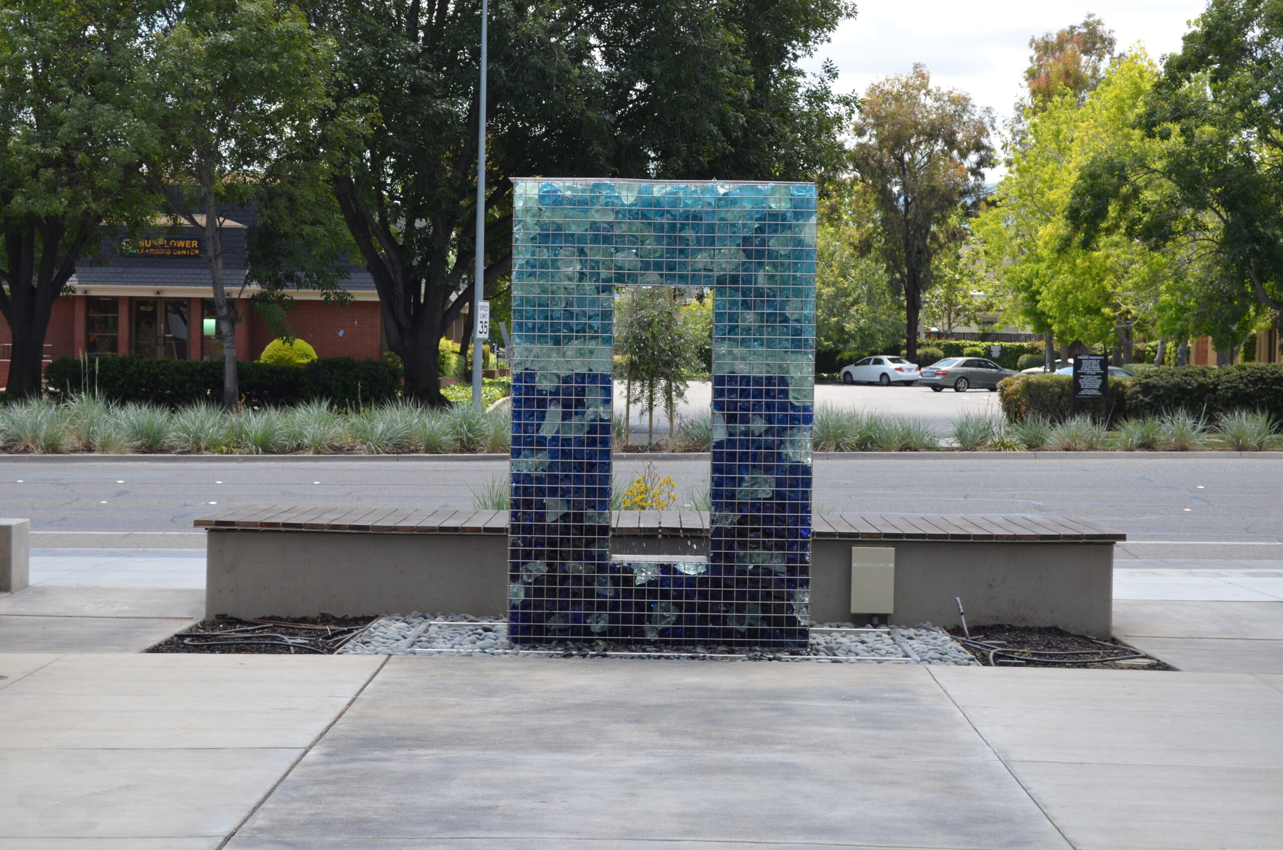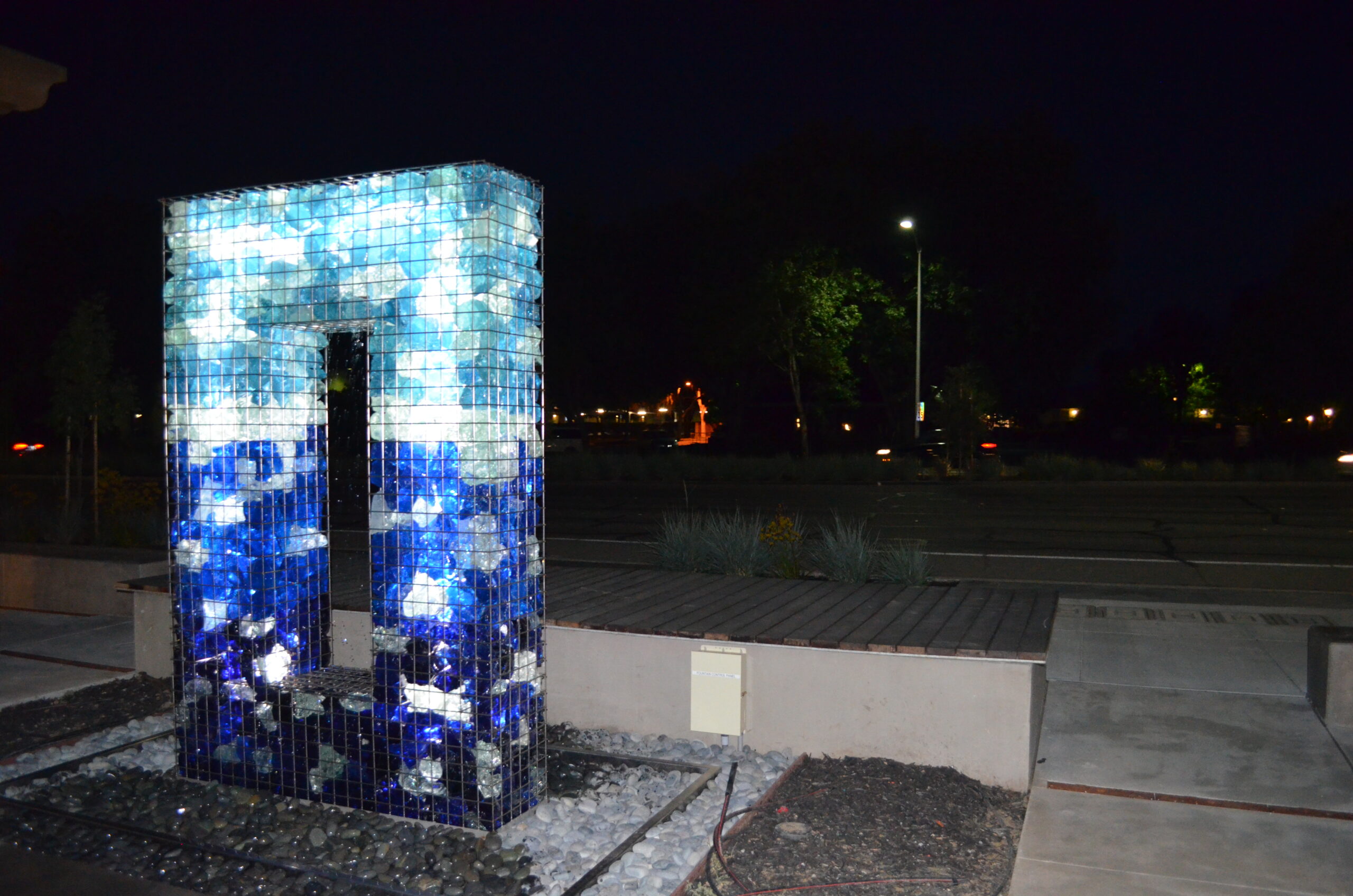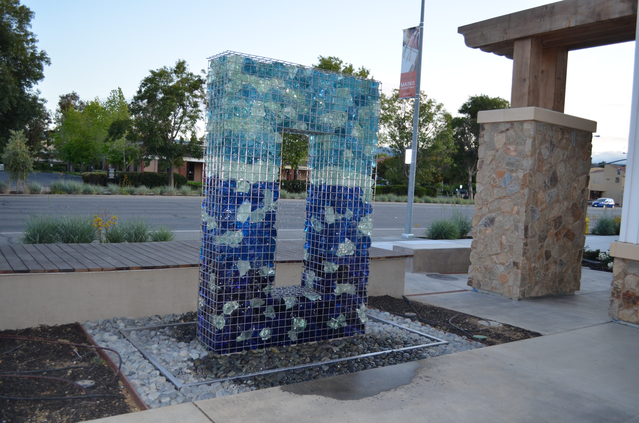 Main Street Cupertino is an 18 acre mixed use project in the heart of Silicon Valley. Yard Art supplied many of the site furnishings there including this LED Gabion Fountain. It serves as a fountain, and at night the LED illuminates the colored rocks contained inside the Gabion.